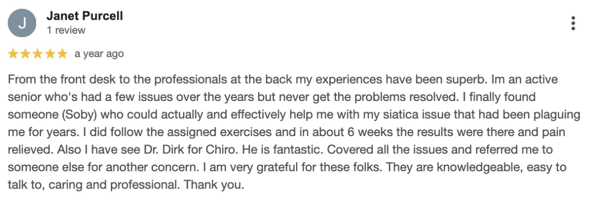 Unlike most clinics in the area... We give you 1-1 care with an expert physical therapist, use top manual therapy techniques, and we use latest technology to help you heal. These things are often missing at other clinics.
